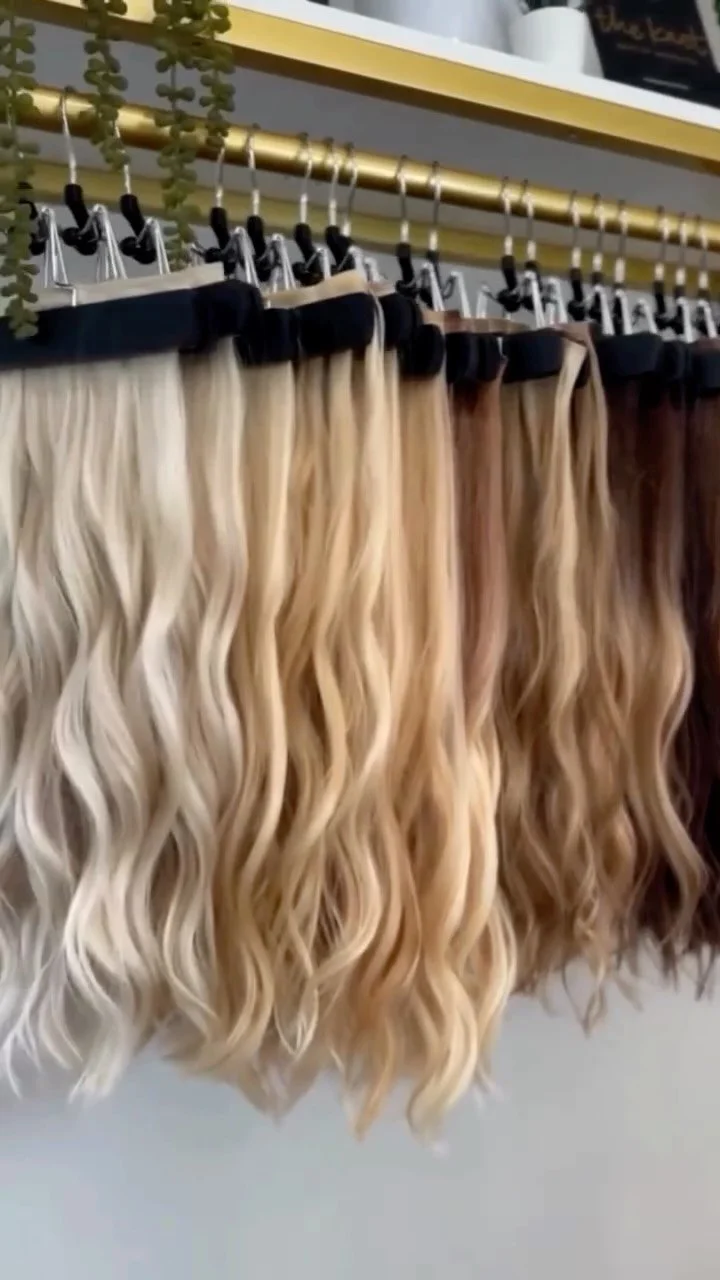 Our 3-in-1 Hair Wrap, also known as a Halo hair extension, takes advantage of your head’s natural shape by sitting comfortably on the crown of your head with an invisible wire and removable clips for secure attachment.